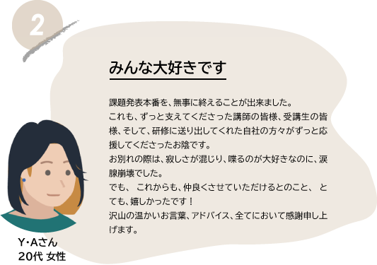 リモートであっても、直接、講師のサポートが受けられ、共に研修する仲間とも助け合い励まし合いながら進めることができます。