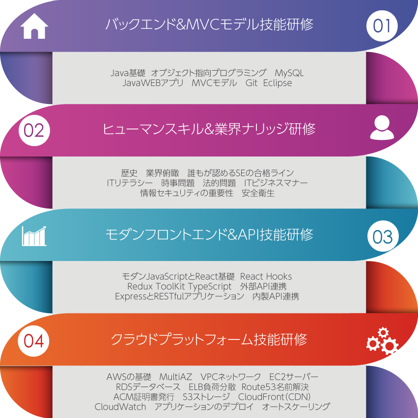 モダンJavaScriptやAWSなど、最新のトレンドや先進的な技術を学び、市場価値の高い、未来志向のエンジニアを育成します
